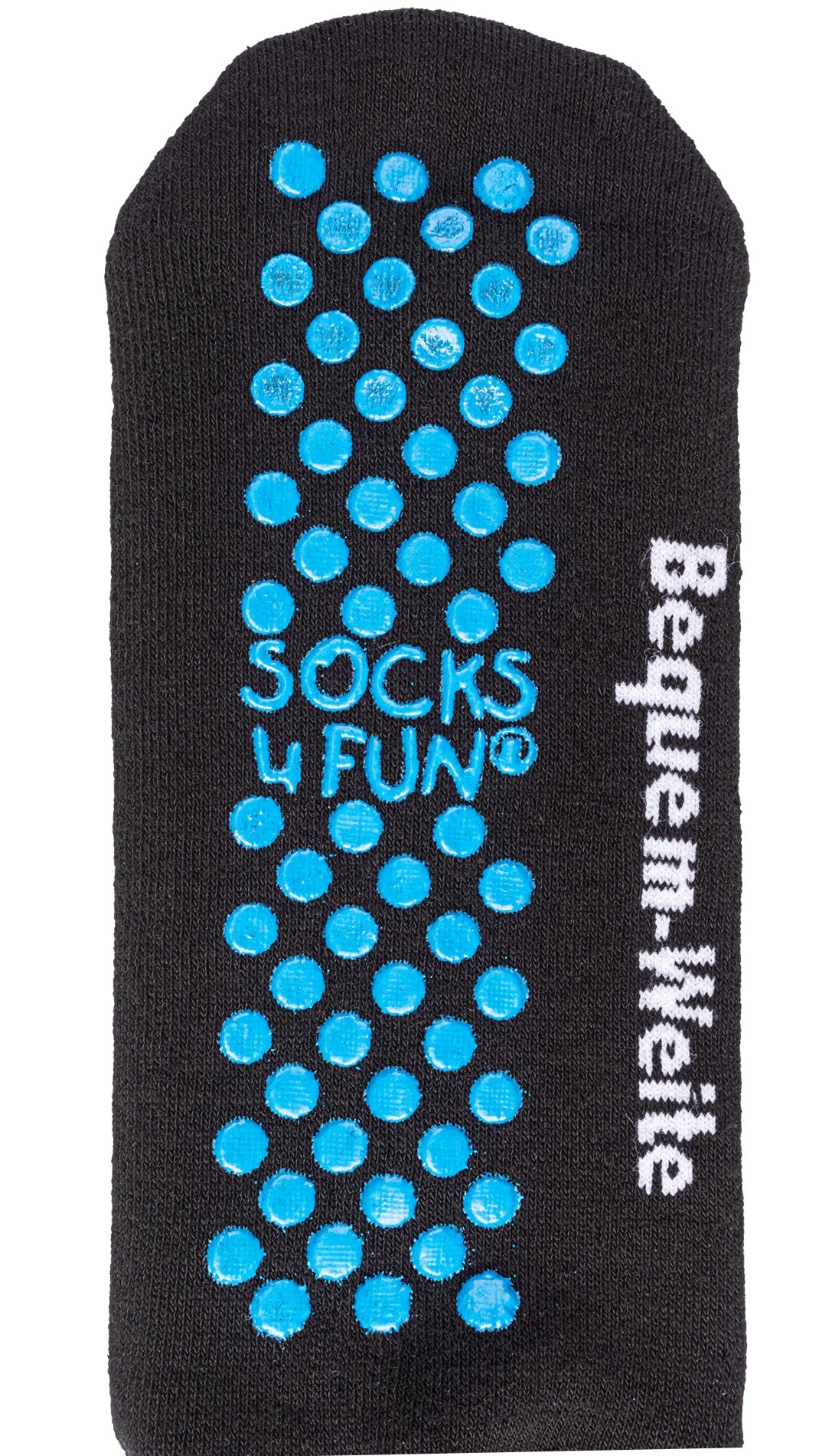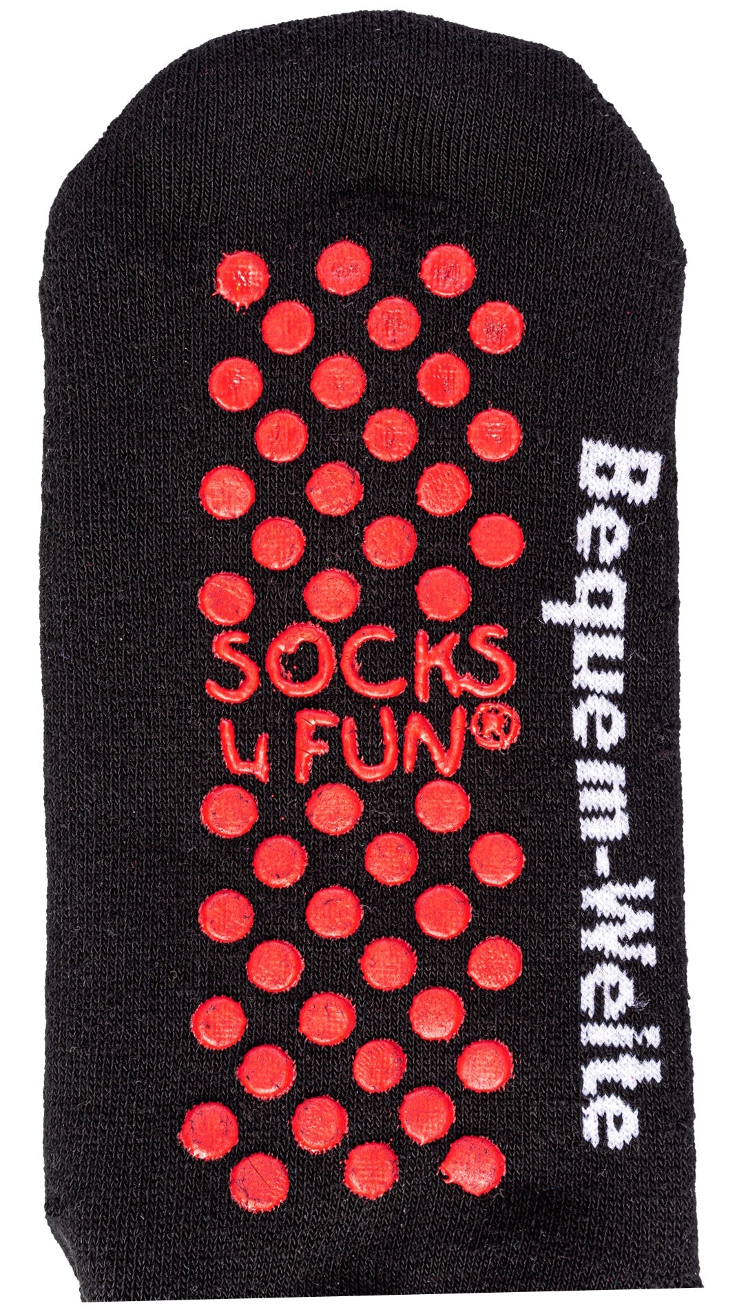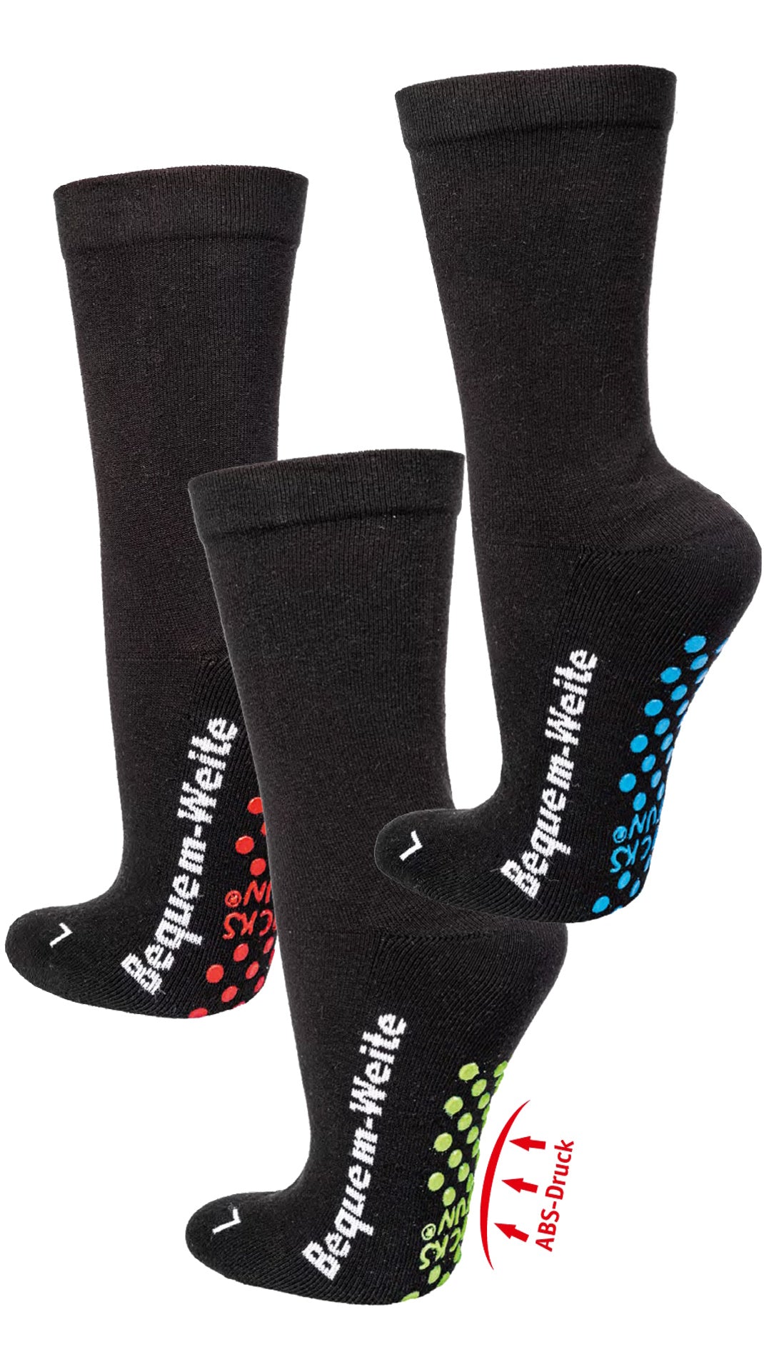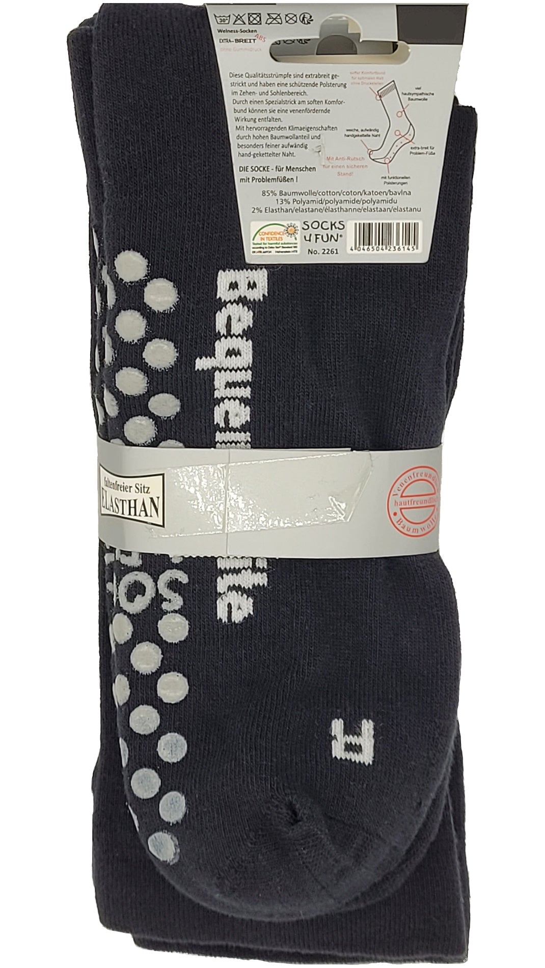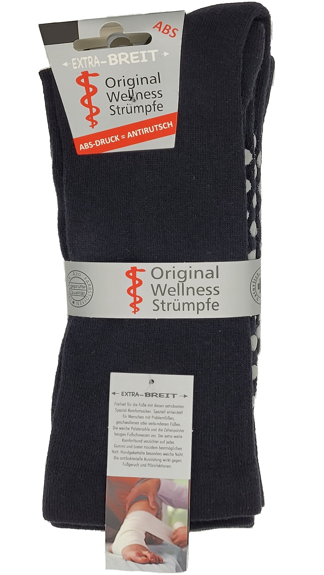 Die Gesundheitssocken mit EXTRA breitem Bund. Der extra-weite Komfort-Bund verzichtet auf jedes Gummi und bietet trotzdem bestmöglichen Halt ohne einzuschnüren. Antirutsch durch ABS-Druck. Die weiche Polstersohle und die Zehenpolster beugen Fußschmerzen vor. Die traditionell handgekettelte weiche Naht verhindert Druckstellen an den Zehen. Speziell entwickelt für Menschen mit Problemfüßen, geschwollenen oder verbundenen Füßen. Rote ABS-Noppen = 35-38, Grüne ABS-Noppen = 39-42, Blaue ABS-Noppen = 43-46, Graue ABS-Noppen = 47-50, Orange ABS-Noppen = 51-54.