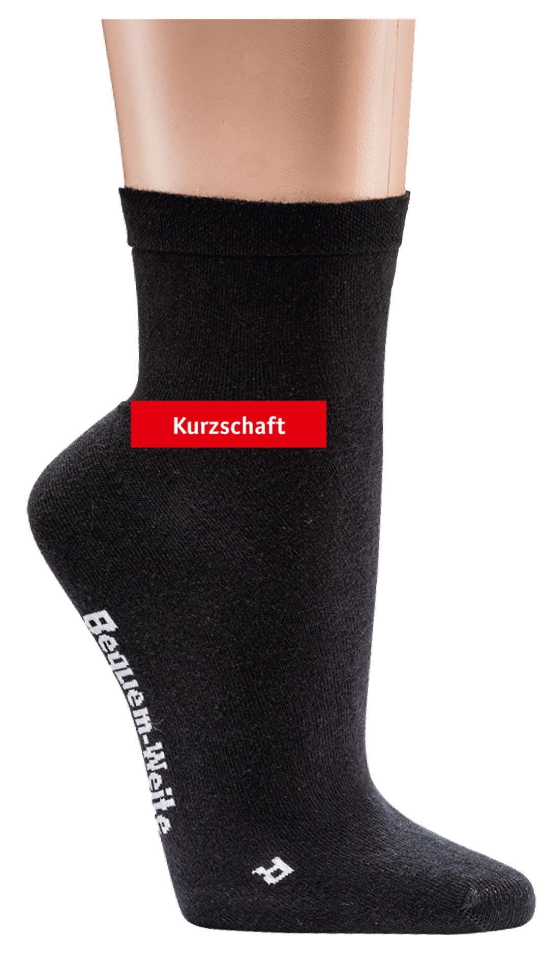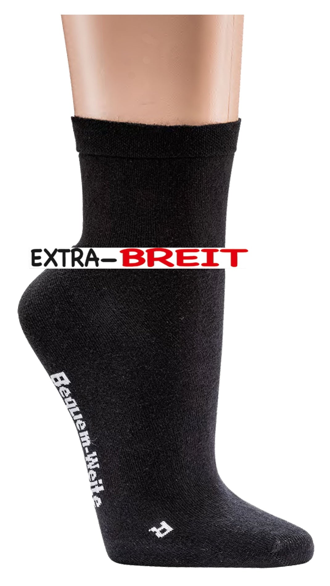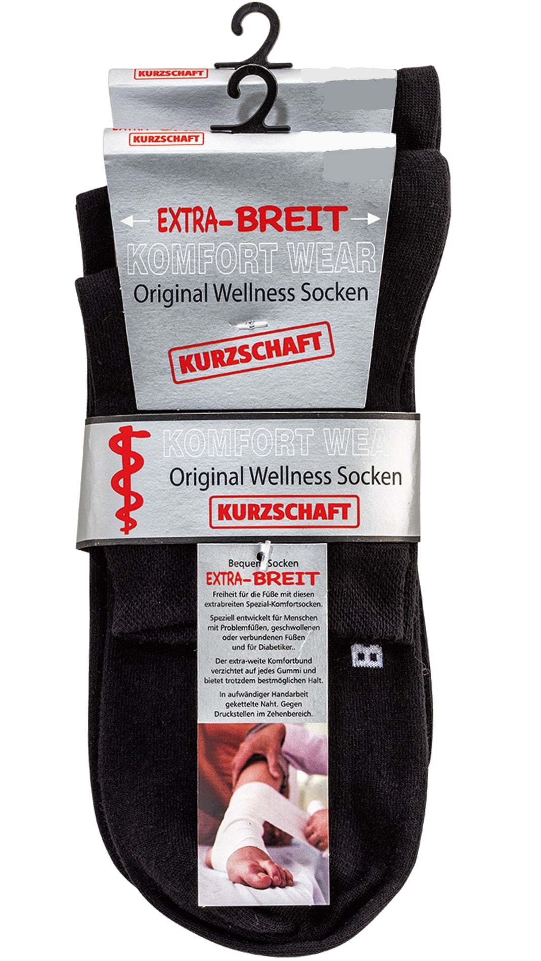 Diese extra breiten Kurzschaft Gesundheitssocken aus Baumwolle mit Elasthan bieten wir im 2er Pack an. Der Umfang dieser Socke beträgt ca. 40 cm. Kurzschaftversion! die Sockenhöhe beträgt ca. 13 cm. Der Spann gibt super gut nach und kann somit auch über eine Binde (gebundene Füße) gezogen werden. Noch weiter sind die extra weiten Socken bis 50 cm, als normale Länge. Weiche Naht, gekettelt, perfekt auch für Diabetiker. Glatt gestrickt und durch den Einsatz von Elasthan geben diese Socken auch super gut nach. Sie sind gekennzeichnet mit L und R. Die Gesundheitssocken mit EXTRA breitem Bund. Der extraweite Komfortbund verzichtet auf jedes Gummi und bietet trotzdem bestmöglichen Halt ohne einzuschnüren. Die traditionell handgekettelte weiche Naht verhindert Druckstellen an den Zehen. Speziell entwickelt für Menschen mit Problemfüßen, geschwollenen oder verbundenen Füßen.