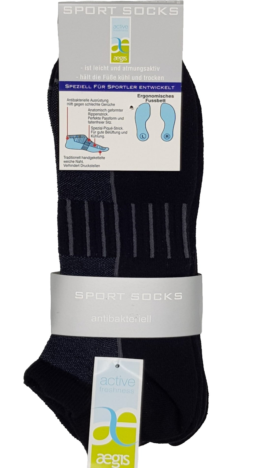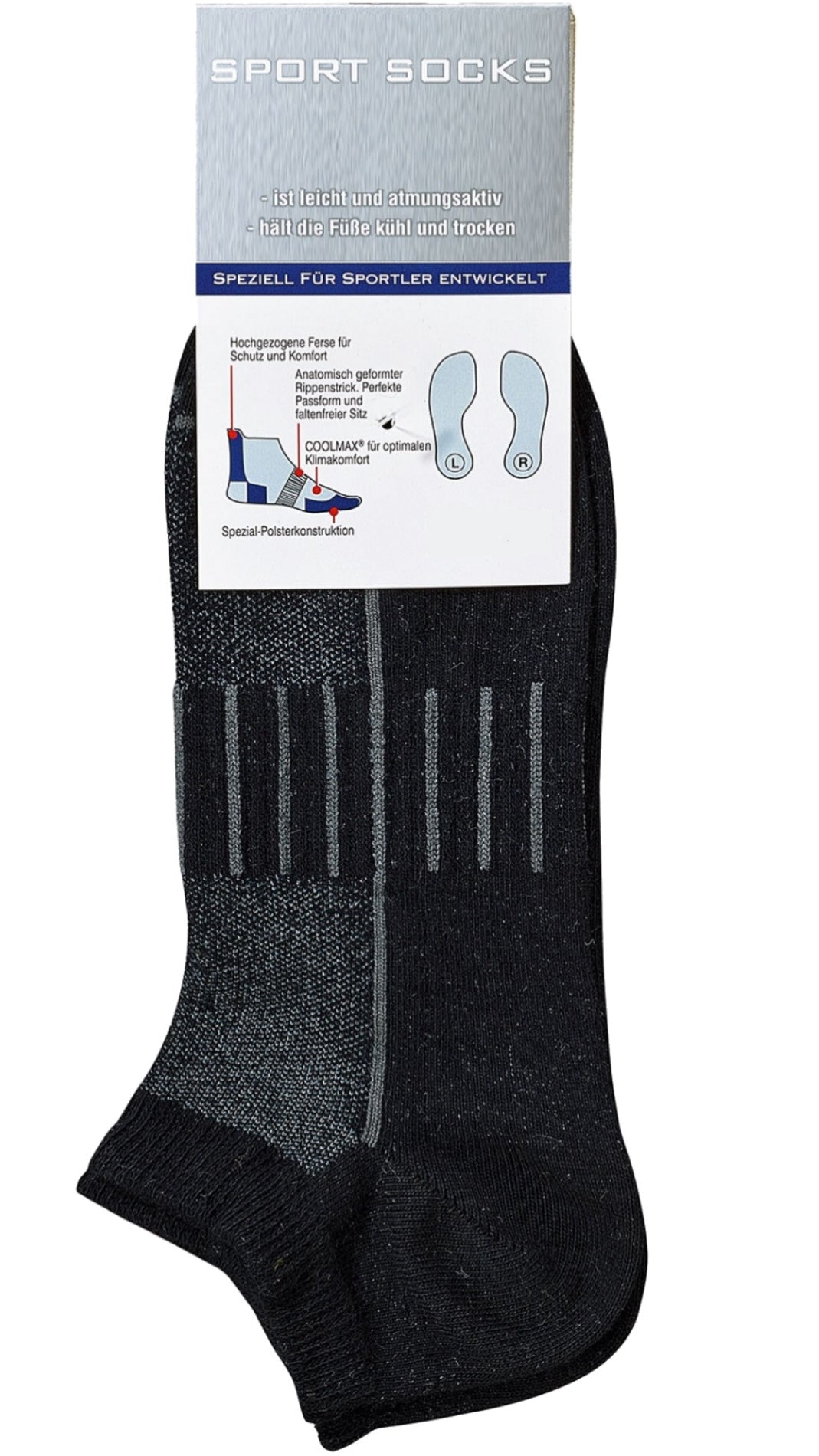 Speziell für Sportler. Bestens geeignet für Running und Biking. Gute Belüftung durch speziellen Piqué-Netzstrick auf dem Fußrücken, lässt die Füße atmen. Anatomisch geformter Rippenstrick in der Fuß Mitte für perfekte Passform. Mit hochwertiger traditionell aufwändig handgekettelter Naht. Vermeidet Druckstellen am empfindlichen Zehenbereich. Mit antibakterieller Ausrüstung gegen Fußpilz und unangenehme Gerüche.